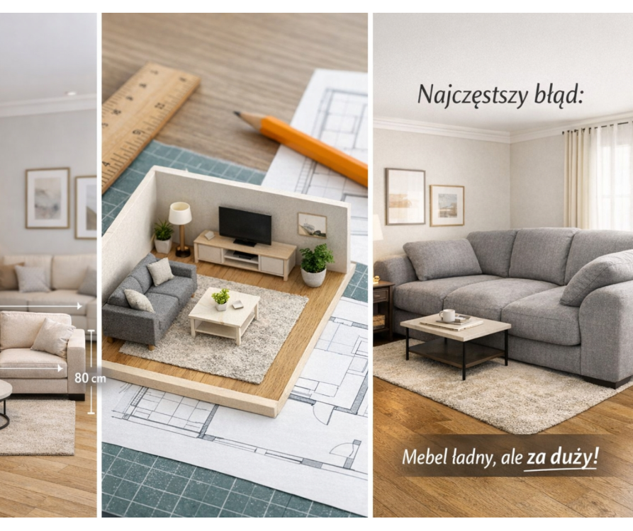 Problem polega na tym, że większość decyzji zakupowych zapada jeszcze przed realnym zmierzeniem przestrzeni. Zdjęcia aranżacyjne, wizualizacje i kadrowane ujęcia nie oddają prawdziwej skali mebla. Sofa może wyglądać lekko i elegancko na ekranie, a po wniesieniu do salonu okazuje się zbyt masywna. Komoda, która na zdjęciu wydaje się w sam raz, w rzeczywistości ginie przy zbyt dużej ścianie. Kierowanie się wyłącznie intuicją i wrażeniem „na oko” to najkrótsza droga do błędów, które trudno naprawić już po zakupie mebli i ustawieniu ich w gotowym wnętrzu.