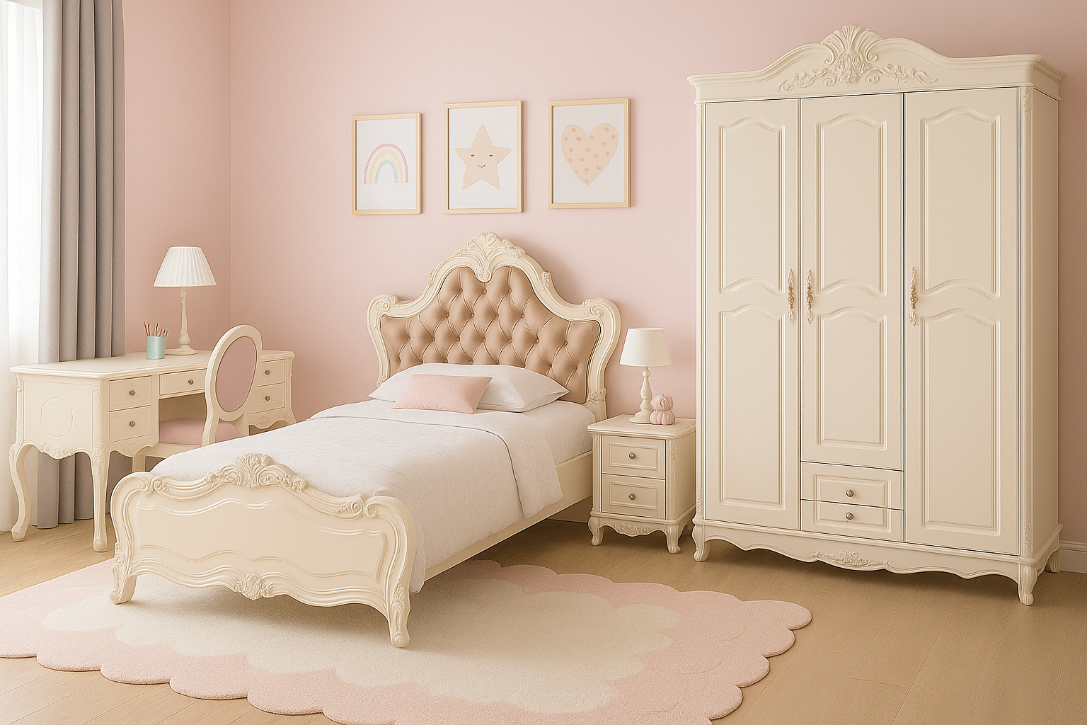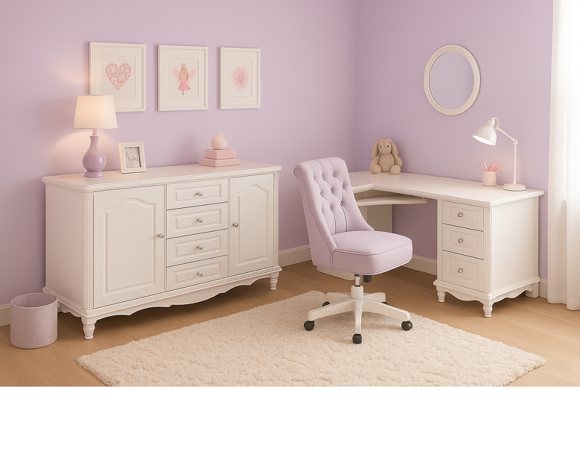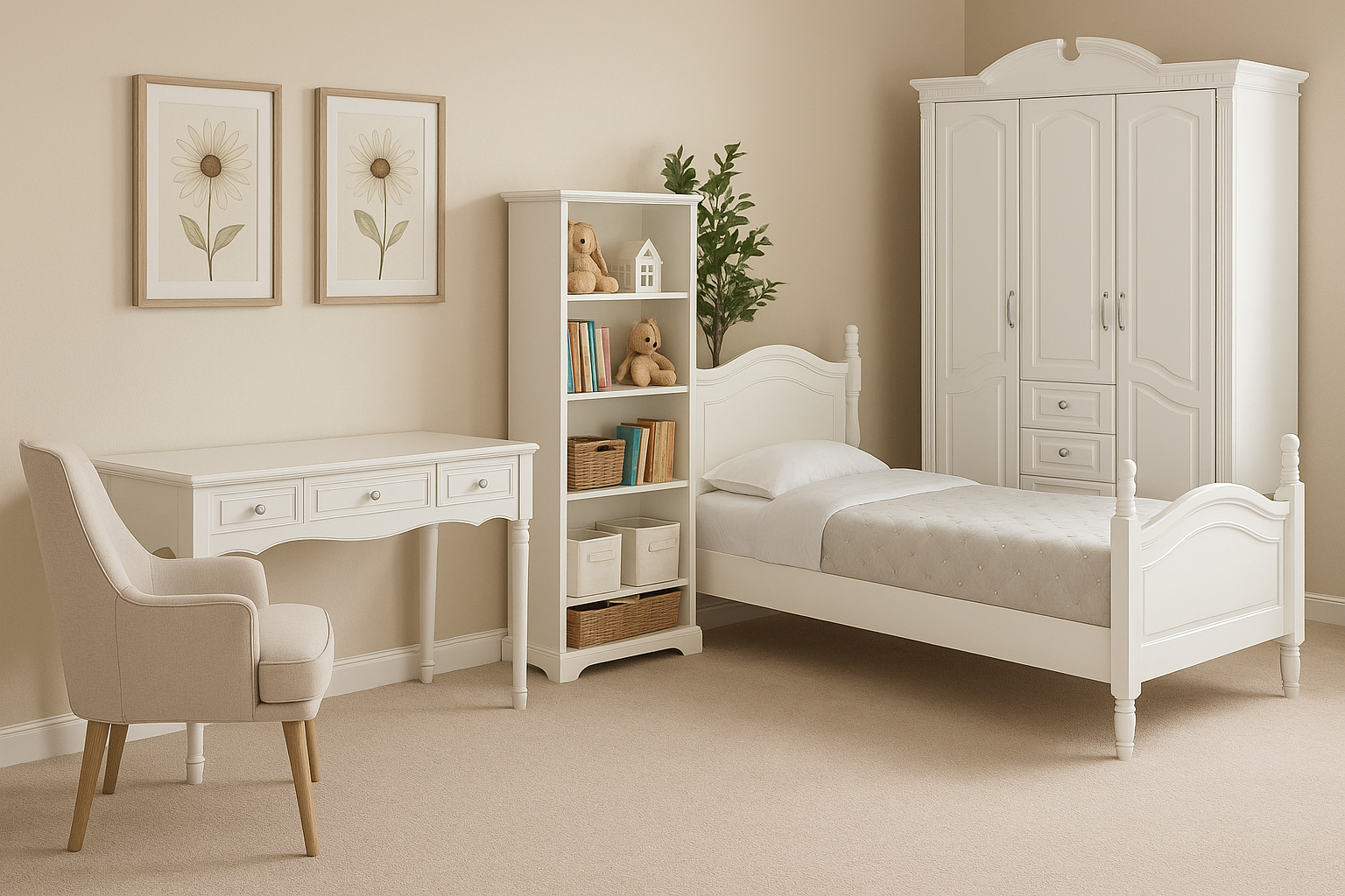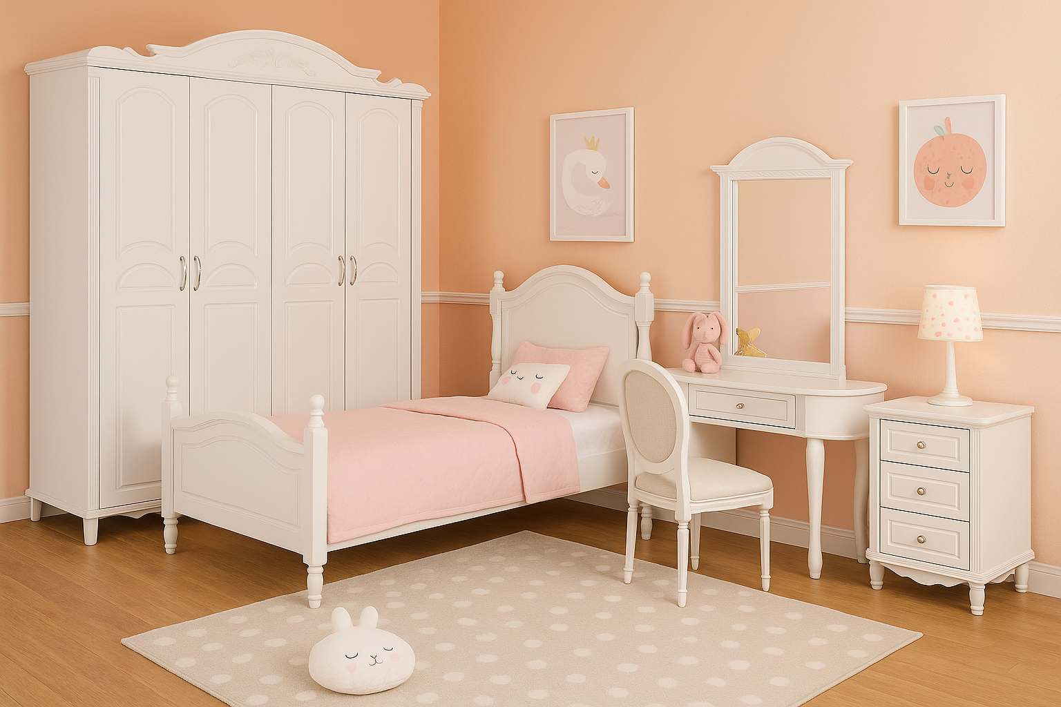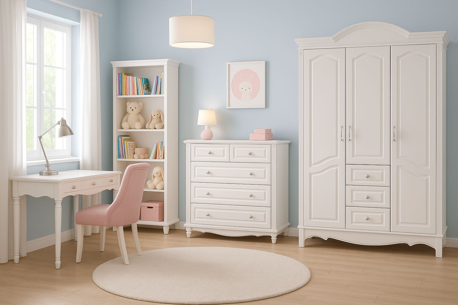 Jednym z najlepszych rozwiązań są białe meble w klasycznym stylu. Dlaczego? Bo są uniwersalne, eleganckie i potrafią rosnąć razem z dzieckiem. Niezależnie od tego, czy nasza córka ma 6, 9 czy 13 lat – biała baza wciąż pozostaje aktualna i łatwa do uzupełnienia nowymi dodatkami.