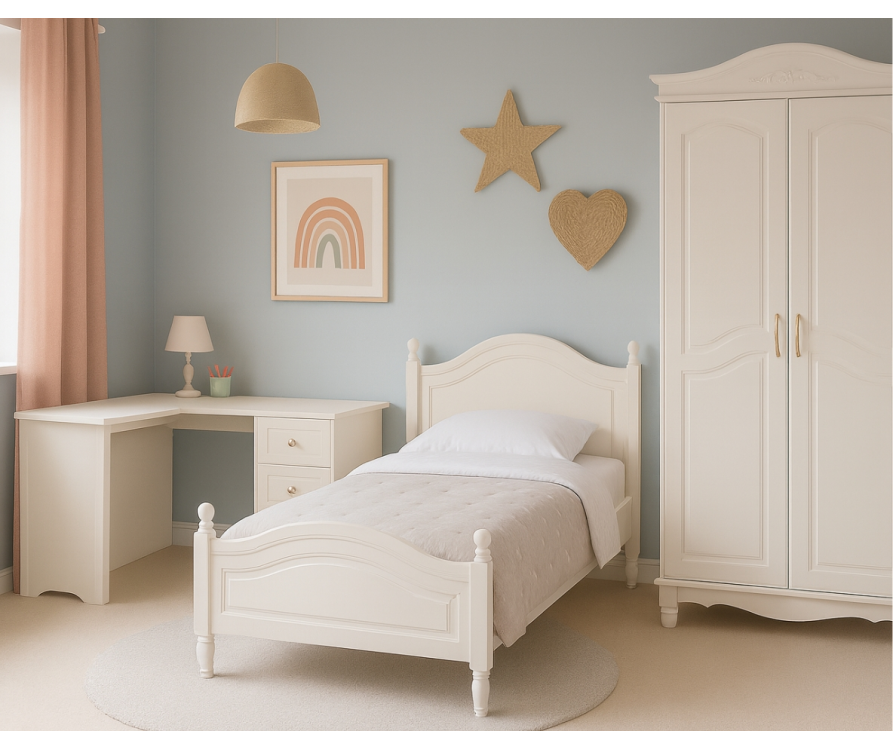 Łóżko to najważniejszy punkt całego wnętrza. W klasycznej wersji z białą ramą i dekoracyjnym zagłówkiem prezentuje się lekko i elegancko. W połączeniu z pastelową pościelą staje się miejscem przytulnym i dziewczęcym. W zestawie z neutralnymi tkaninami (beże, szarości) nabiera bardziej „dorosłego” charakteru, dzięki czemu nie trzeba wymieniać mebla, gdy dziecko podrośnie.