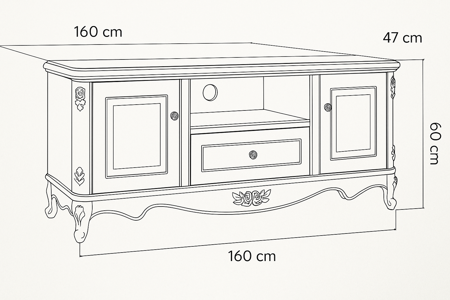 Szafka RTV Anastasia to elegancki mebel, który łączy styl francuski z funkcjonalnością, tworząc idealne rozwiązanie do każdego salonu inspirowanego klasycznym designem. Wykonana z płyty MDF i drewna, wyróżnia się trwałością oraz dbałością o detale, a jej subtelnie zaokrąglone linie dodają lekkości i wyrafinowania. Szafka posiada dwoje drzwi z ozdobnymi frontami, które zapewniają przestrzeń do przechowywania akcesoriów i drobnych sprzętów RTV, dzięki czemu wnętrze pozostaje uporządkowane.