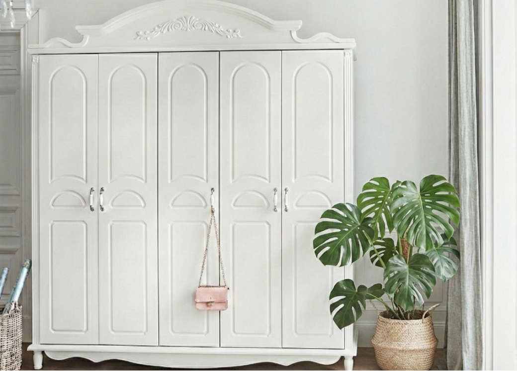 Szafa Antonina w stylu angielskim to propozycja stworzona z myślą o osobach ceniących wyrafinowaną elegancję i przestronność w przechowywaniu. Jej imponujące rozmiary oraz staranne wykończenia sprawiają, że jest nie tylko funkcjonalnym, ale i dekoracyjnym elementem wnętrza. Fronty zdobione subtelnymi frezowaniami oraz misternie rzeźbiony gzyms nadają szafie unikalnego charakteru, wprowadzając do pomieszczenia przytulny, klasyczny klimat. Wykonana z płyty MDF i naturalnego drewna, gwarantuje trwałość oraz stabilność. Praktyczne wnętrze zostało podzielone na kilka sekcji z półkami oraz drążkiem na ubrania, co pozwala na łatwą organizację przechowywania odzieży i tekstyliów. Kolor złamanej bieli podkreśla ponadczasowy styl szafy, jednocześnie optycznie powiększając przestrzeń. 5 skrzydłowych drzwi umożliwia wygodny dostęp do każdej części szafy, a eleganckie białe uchwyty dodają całości wyrafinowanego wyglądu. Szafa Antonina to idealne rozwiązanie dla tych, którzy pragną połączyć funkcjonalność z klasycznym pięknem, tworząc we wnętrzu harmonię i wyjątkowy nastrój.
