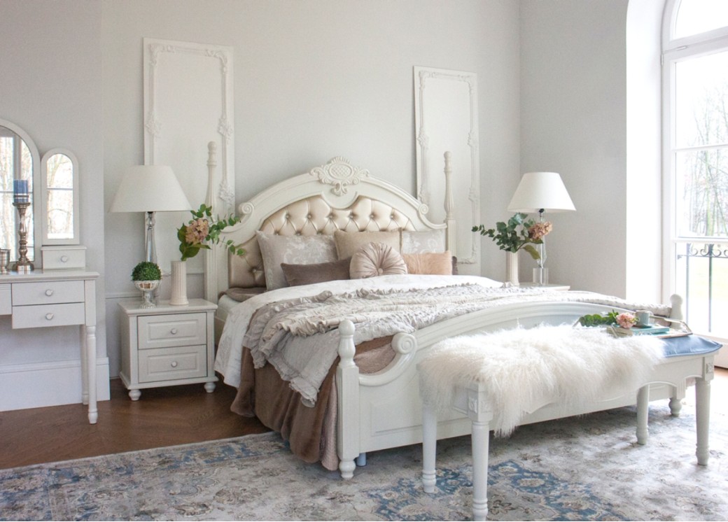 Łóżko Arabella to wyrafinowany mebel w stylu angielskim, który łączy w sobie elegancję i klasyczną estetykę z nowoczesną funkcjonalnością. Wykonane z wysokiej jakości płyty MDF oraz osadzone na solidnych, drewnianych nogach, zapewnia stabilność. Centralnym punktem tego łóżka jest majestatyczne, wysokie wezgłowie z efektownym, pikowanym obiciem w kolorze szampana, ozdobione kryształkami, które tworzą wzór w stylu Chesterfield. Delikatny połysk tapicerki nadaje całości luksusowego charakteru, sprawiając, że łóżko staje się idealnym wyborem do eleganckich sypialni. Ramy łóżka zdobią dekoracyjne rzeźbienia oraz łagodnie wygięte linie, które wprowadzają do wnętrza harmonię i równowagę. Arabella to nie tylko wygodne miejsce do snu, ale również piękny element wystroju, który podkreśla dobry gust właściciela. Dzięki połączeniu klasycznych detali z jasną kolorystyką mebel doskonale komponuje się zarówno z wnętrzami w stylu glamour, jak i klasycznej elegancji. To łóżko stanie się efektowną ozdobą każdej sypialni, wnosząc do niej atmosferę luksusu i komfortu.