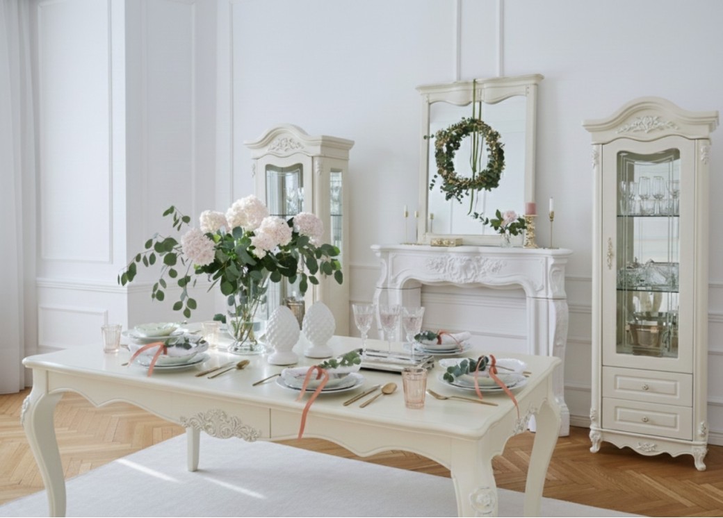 Kolekcja La Perle to prawdziwe zaproszenie do świata wyrafinowanego luksusu, w którym piękna forma przenosi nas w baśniową rzeczywistość. Każdy element tej linii mebli glamour zachwyca subtelną, waniliową bielą, która stanowi tło dla bogatych zdobień i finezyjnych rzeźbień. Charakterystyczne dla La Perle są błyszczące ornamentowe gałki i uchwyty, a także srebrzone detale w postaci różanych motywów, które podkreślają unikalność każdego mebla.