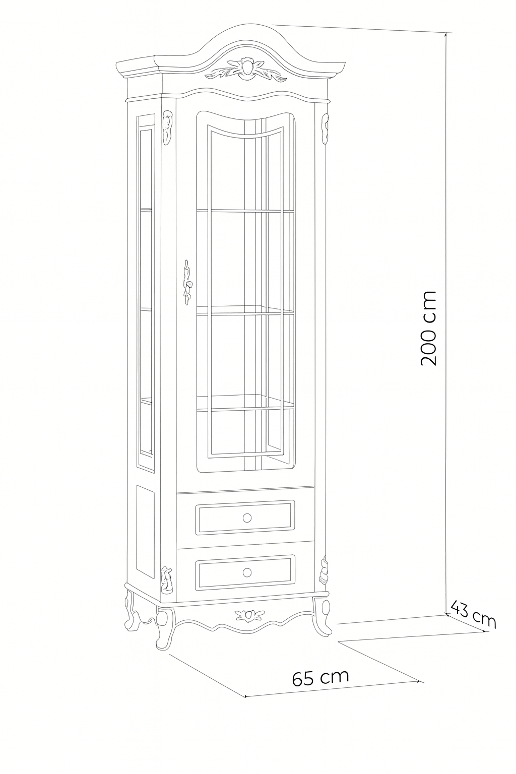 Witryna Gloria to elegancki mebel w stylu francuskim, który łączy klasyczne piękno z funkcjonalnością. Wykonana z płyty MDF i drewna, zachwyca pięknymi detalami i wyjątkowym wykończeniem. Przeszklone drzwi frontowe i boki sprawiają, że witryna doskonale eksponuje przechowywane w niej dekoracje, szkło czy porcelanę. Szklane półki umożliwiają estetyczne rozłożenie przedmiotów, a dwie szuflady w dolnej części oferują dodatkową przestrzeń na drobiazgi, których nie chcemy przechowywać na widoku.