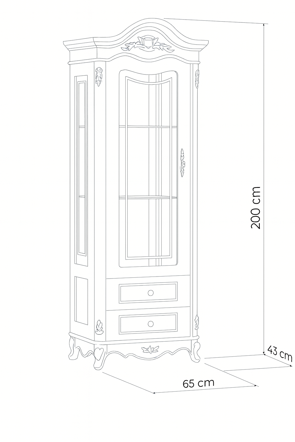 Witryna Gloria to elegancki mebel w stylu francuskim, który łączy klasyczne piękno z funkcjonalnością. Wykonana z płyty MDF i drewna, zachwyca pięknymi detalami i wyjątkowym wykończeniem. Przeszklone drzwi frontowe i boki sprawiają, że witryna doskonale eksponuje przechowywane w niej dekoracje, szkło czy porcelanę. Szklane półki umożliwiają estetyczne rozłożenie przedmiotów, a dwie szuflady w dolnej części oferują dodatkową przestrzeń na drobiazgi, których nie chcemy przechowywać na widoku.