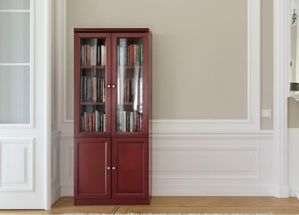 Klasyczna szafa biurowa 2-drzwiowa do przechowywania. Górne drzwi szafy przeszklone, dolne pełne, wykonane w technologii ramowo-płycinowej. Drzwi zamykane na kluczyk, wewnątrz są praktyczne półki o regulowanej wysokości. Szafa jest fornirowana, elegancko wykończona. Podstawę szafy stanowi prosty, dość wysoki gzyms, cokół z lekkim frezowaniem. Szafa sprawdzi się w eleganckim biurze, gabinecie lub urzędzie do przechowywania dokumentów i materiałów biurowych.