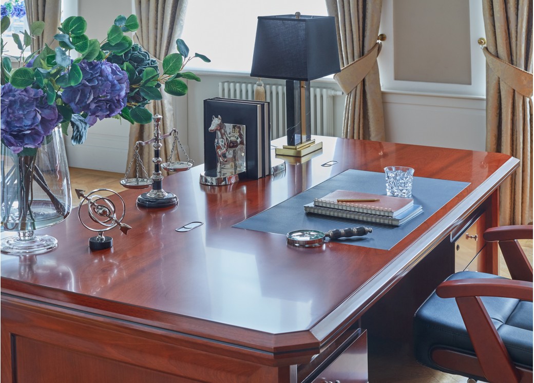 - Blat biurka zawiera wstawkę ze skóry ekologicznej, która zabezpiecza powierzchnię przed zarysowaniem