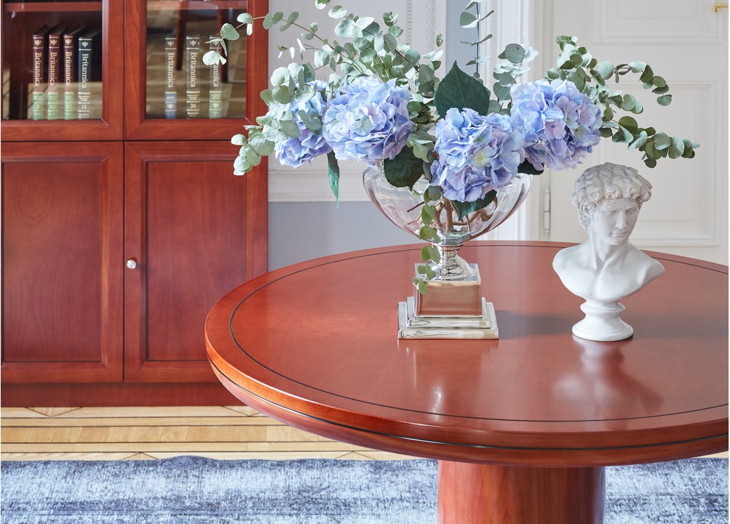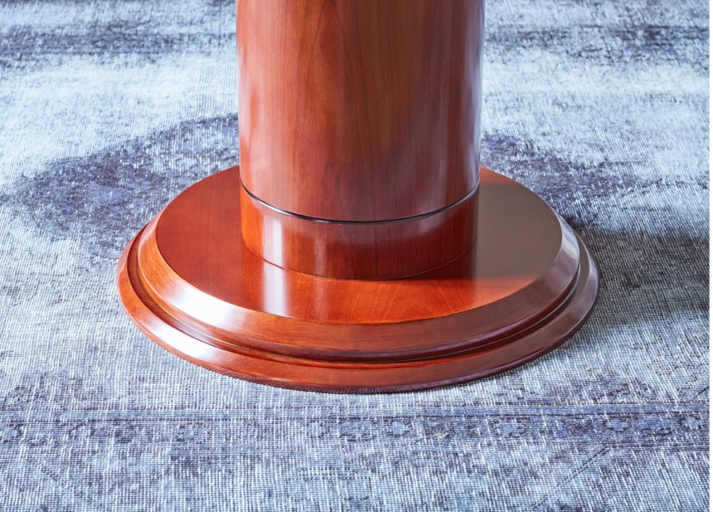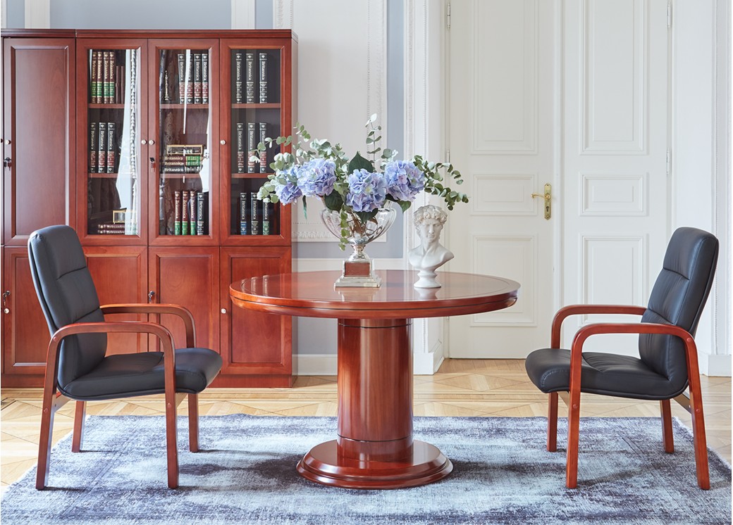 Okrągły stolik biurowy o uniwersalnej klasycznej formie. Blat został osadzony na okrągłej kolumnie. Krawędź, rant i podstawa są frezowane. Stolik jest fornirowany, ma piękny kolor koniaku, jest elegancko wykończony. Stolik Conference doskonale sprawdzi się w biurze do kameralnych wewnętrznych spotkań, a także do mniejszych spotkań z klientami. Może pełnić funkcję stolika okolicznościowego lub podręcznego mebla pomocniczego.