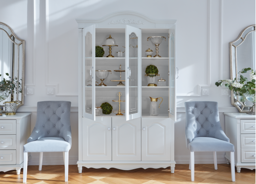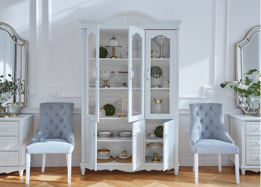 Serce kolekcji stanowią przeszklone witryny, zarówno wysokie, jak i niskie, zwieńczone gzymsami zdobionymi misternymi sztukateryjnymi elementami. To idealne miejsce, by wyeksponować rodzinne pamiątki czy kolekcję porcelany. Stół jadalniany wraz z eleganckimi krzesłami stanie się centrum rodzinnego życia, gdzie będziecie dzielić nie tylko posiłki, ale i najcenniejsze chwile.