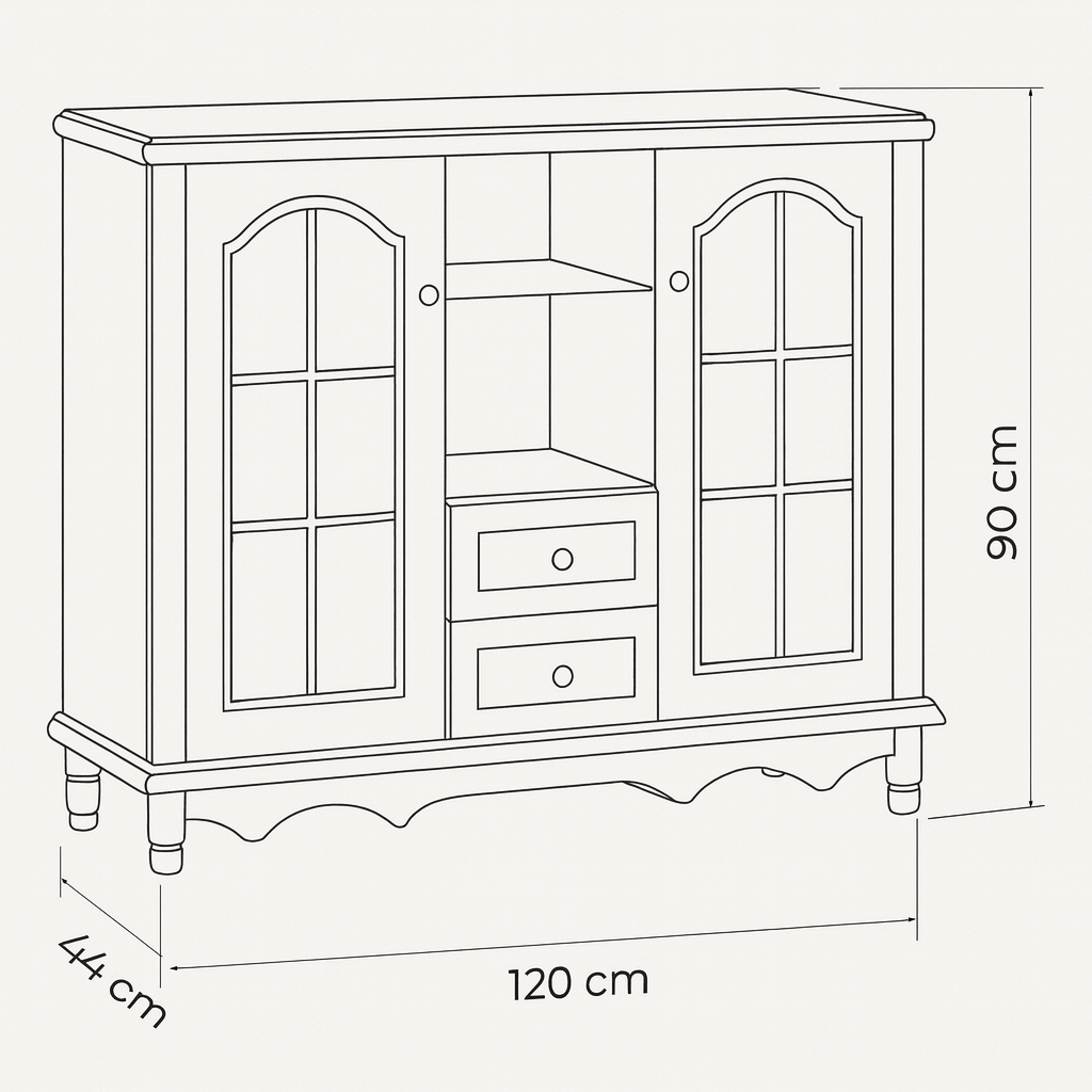 Komoda Claire w stylu angielskim to elegancki mebel, który wyróżnia się klasycznym designem i funkcjonalnością, idealnie uzupełniając każde wnętrze. Komoda wykonana z wysokiej jakości płyty MDF i drewna, zachwyca solidnym wykonaniem oraz precyzyjnym wykończeniem. Przeszklone drzwiczki z ozdobnymi malowanymi szprosami tworzą efektowną oprawę dla półek, które pozwalają wyeksponować dekoracje, książki lub ulubioną zastawę. Centralna część komody wyposażona jest w dodatkowe półki i dwie praktyczne szuflady, które pomieszczą drobne przedmioty, pomagając zachować porządek. Gustowne uchwyty oraz subtelne zdobienia dodają całości elegancji, podkreślając jej angielski charakter. Delikatnie frezowana podstawa i profilowane nóżki nadają komodzie lekkości, a łagodnie wykończony blat świetnie sprawdzi się jako miejsce na rodzinne fotografie czy stylowe lampy. Komoda Claire to idealny wybór dla tych, którzy poszukują mebla łączącego ponadczasowy styl z nowoczesną funkcjonalnością. Sprawdzi się zarówno w salonie, jadalni, jak i sypialni, wprowadzając do wnętrza atmosferę klasy i harmonii.