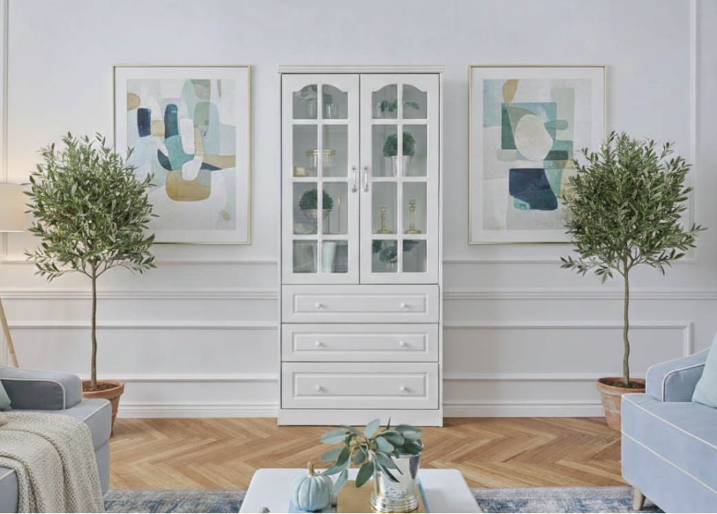 Stylowy biały regał 2-drzwiowy z szufladami do salonu. Drzwi regału mają przeszklenia, są wykończone szprosami. W podstawie znajdują się 3 pojemne szuflady ozdobione prostymi frezowaniami. Drzwi i szuflady są wyposażone w ceramiczne uchwyty. Regał sprawdzi się także jako witryna do salonu lub jadalni.