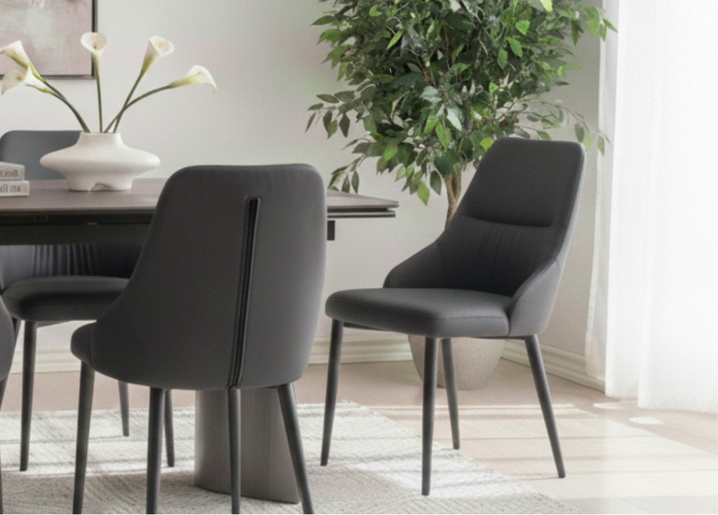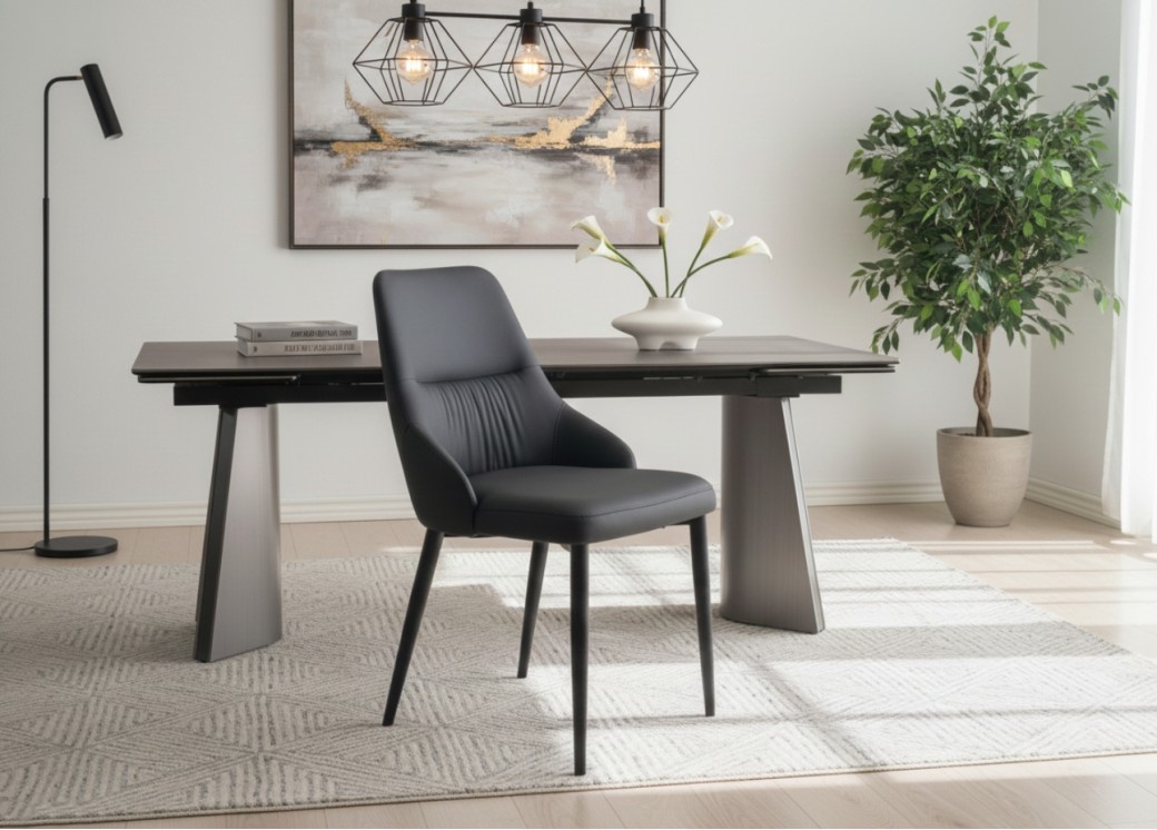 Krzesło Monolit to nowoczesna i prosta forma. Jego smukła sylwetka, delikatnie profilowane oparcie i lekko zwężające się nogi tworzą harmonijną całość, która doskonale odnajdzie się w każdym wnętrzu – od minimalistycznej jadalni po designerską przestrzeń biurową. Tapicerka w głębokim odcieniu czerni nadaje mu wyrafinowany charakter, a miękkie siedzisko zapewnia wysoki komfort użytkowania nawet podczas długich spotkań przy stole. Jest to mebel stworzony z myślą o codziennym użytkowaniu. Skóra ekologiczna jest praktyczna, sprawia, że krzesło łatwo utrzymać w czystości, korzystając z niego w jadalni i w biurze. Przeszycia na oparciu podkreślają dbałość o detale i dodają lekkości całej konstrukcji. Metalowe nogi, pokryte matowym lakierem, nadają krzesłu stabilność oraz nowoczesny akcent, który doskonale komponuje się z aranżacjami inspirowanymi stylem industrialnym, loftowym i modern classic.
