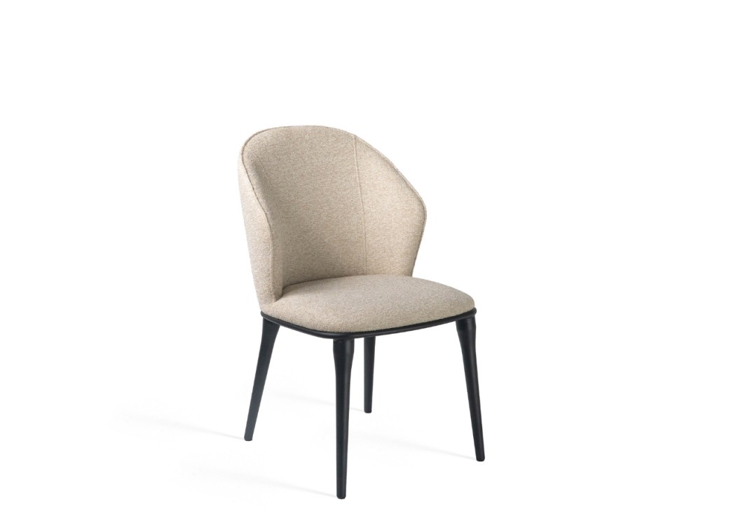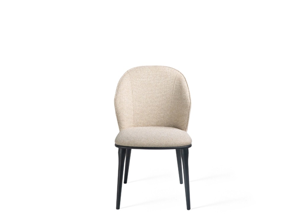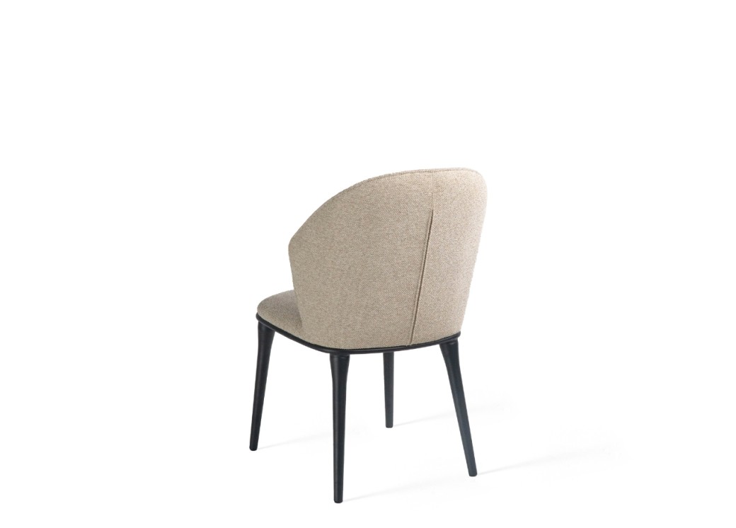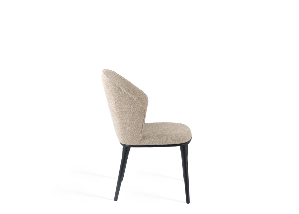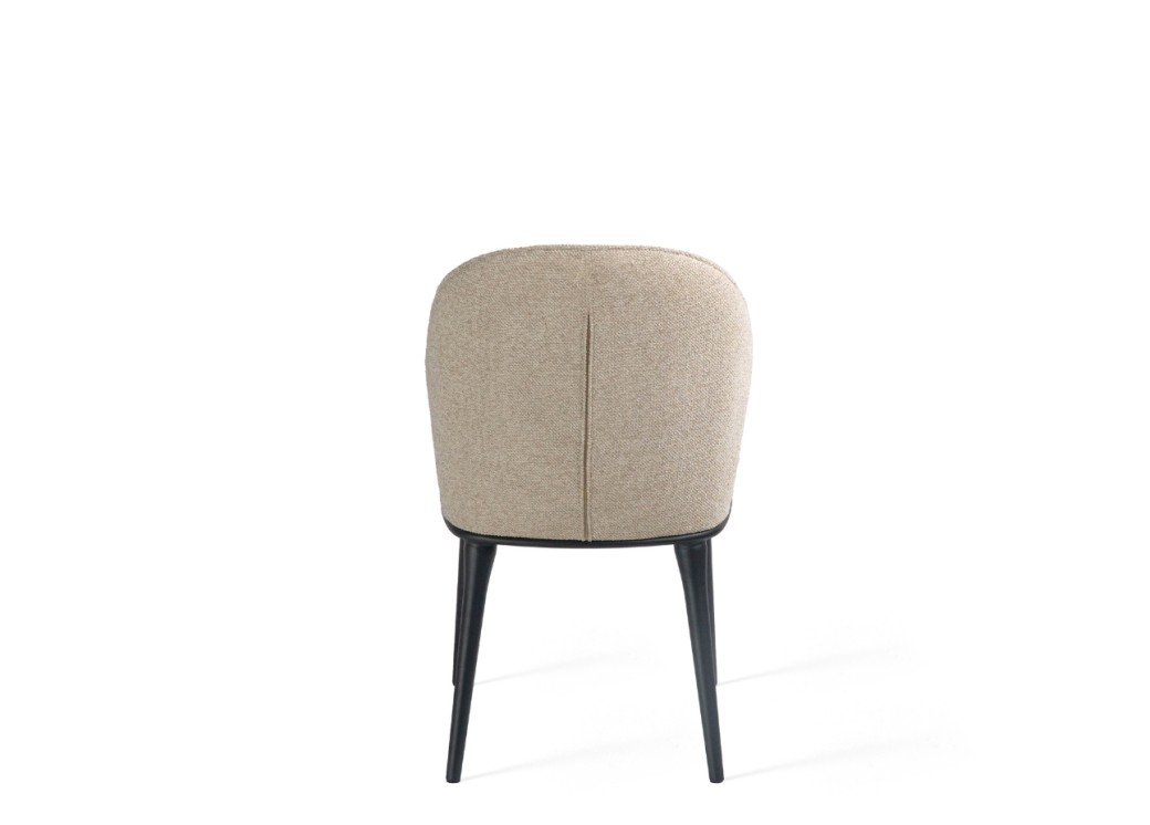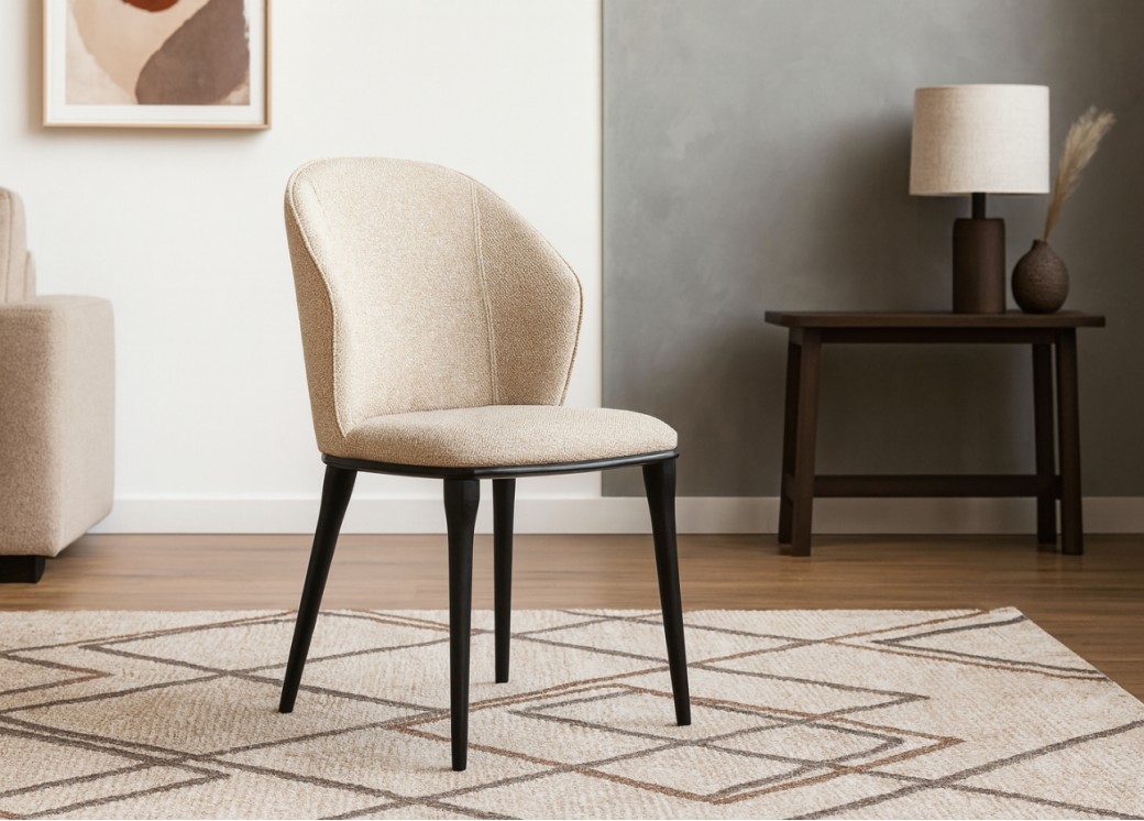 To krzesło łączy prostotę formy z wygodą użytkowania. Tapicerowane miękką tkaniną obiciową, zachwyca przyjemną w dotyku fakturą i stonowanym beżowym odcieniem. Zaokrąglone oparcie otula sylwetkę, zapewniając komfort nawet przy dłuższym siedzeniu. Smukłe, czarne nogi z metalu dodają konstrukcji lekkości i stabilności. Dzięki uniwersalnemu wzornictwu krzesło pasuje zarówno do jadalni, jak i do eleganckiego biura czy kawiarni.