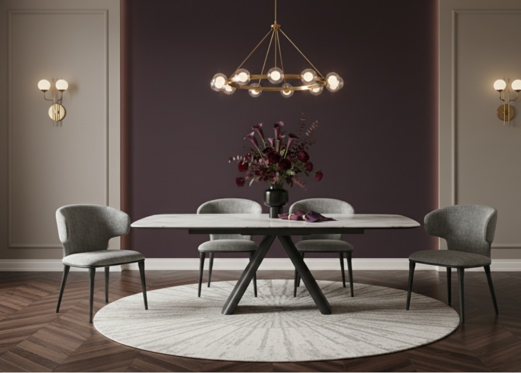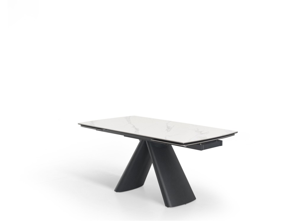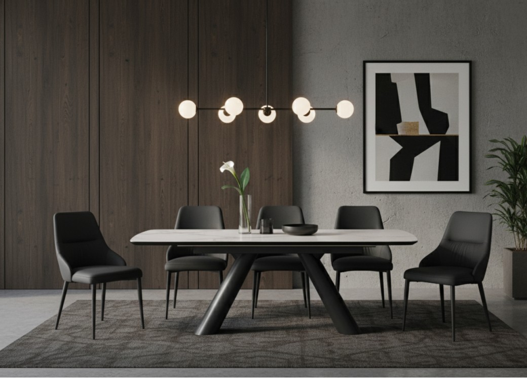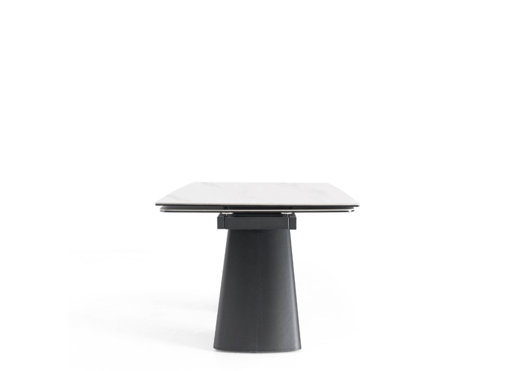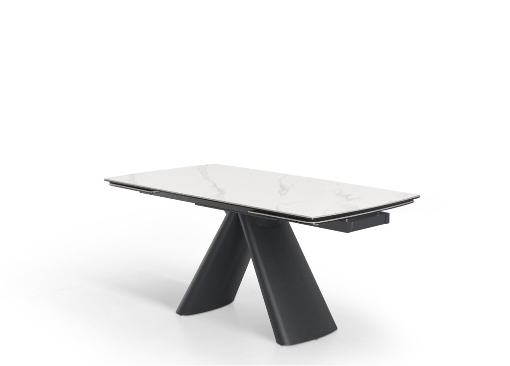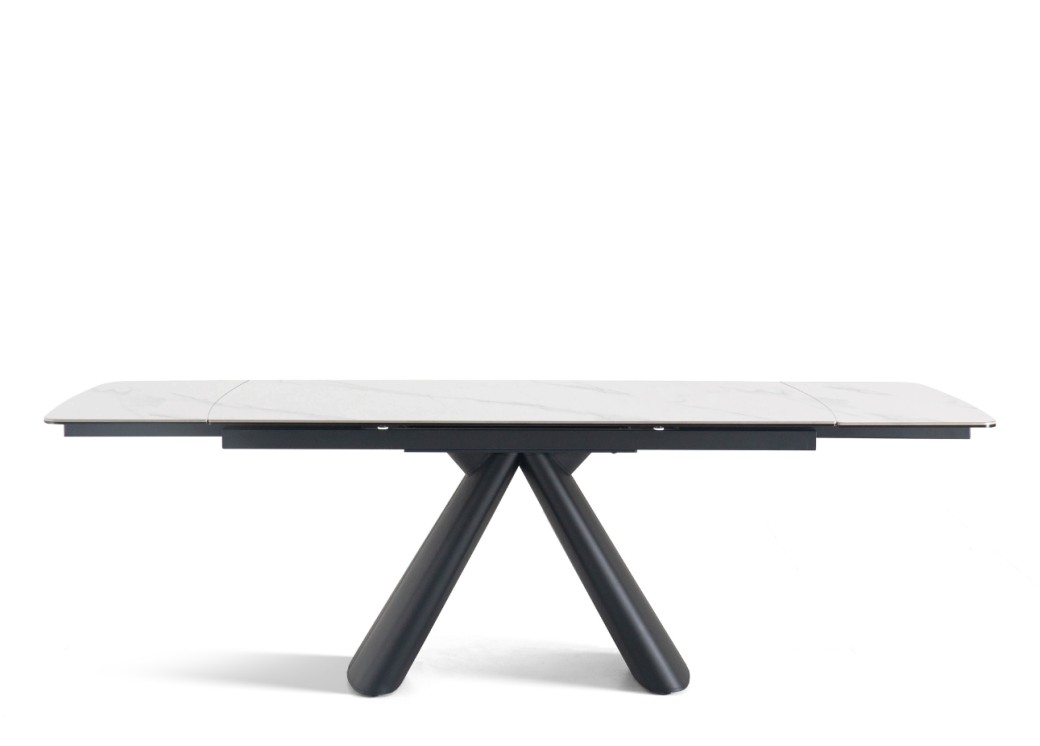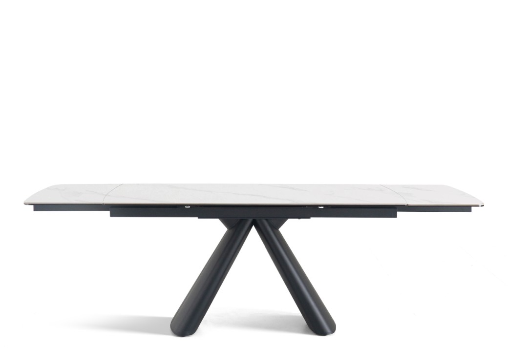 Ten stół to połączenie nowoczesnego designu i solidnego wykonania. Blat z białej mas ceramicznej osadzonej na wzmocnionym, hartowanym szkle prezentuje się elegancko i minimalistycznie. Stabilną podstawę tworzy metalowa rama z malowanymi proszkowo na czarno nogami z karbonowej stali – masywne, lecz wizualnie lekkie dzięki geometrycznej formie. Zestawienie chłodnej bieli blatu i głębokiej czerni podstawy nadaje całości wyrafinowany, industrialny charakter. To mebel, który doskonale odnajdzie się w nowoczesnych wnętrzach zarówno w przestronnej jadalni, jak i eleganckim biurze.