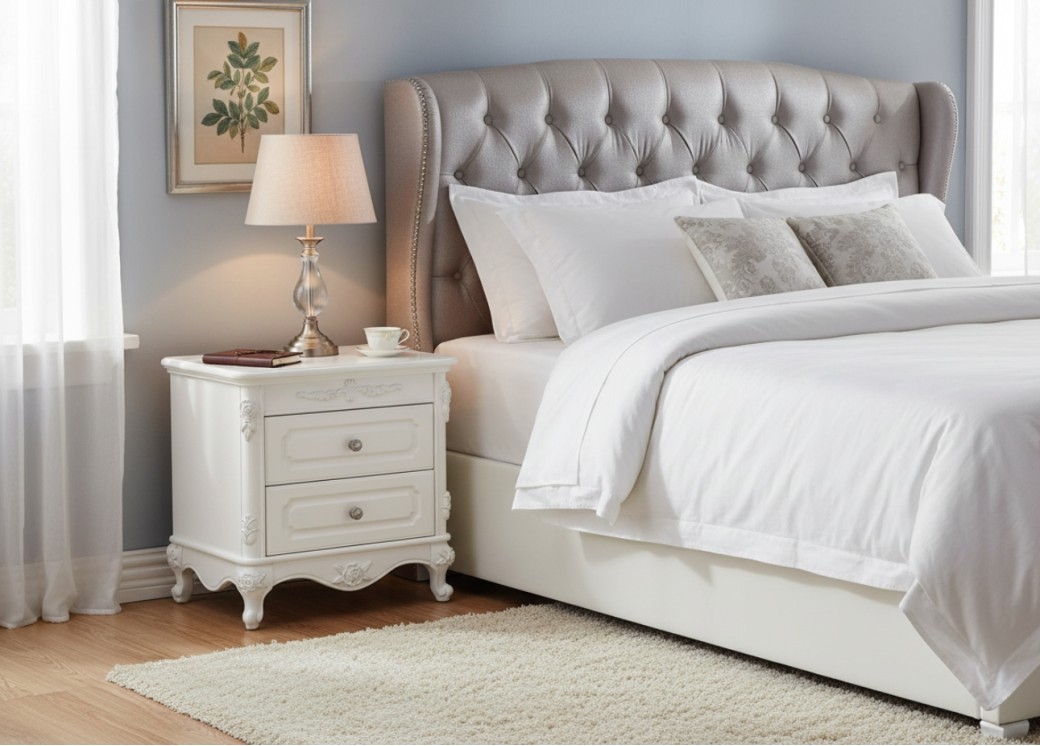 Szafka nocna Amenite to elegancki mebel, który doskonale łączy funkcjonalność z wyszukanym stylem, idealnie wpisując się w aranżacje sypialni w stylu francuskim i glamour. Wykonana z wysokiej jakości płyty MDF oraz drewna, szafka nocna Amenite zachwyca precyzyjnie wykonanymi detalami, które dodają jej subtelnego uroku. Górna część szafki jest ozdobiona delikatnym frezowaniem, a fronty zdobią stylizowane rzeźbienia o motywach różanych, co nawiązuje do klasycznej estetyki mebli pałacowych. Profilowany cokół oraz wygięte nogi o dekoracyjnym wykończeniu nadają całości lekkości, wprowadzając do wnętrza nutę finezji.