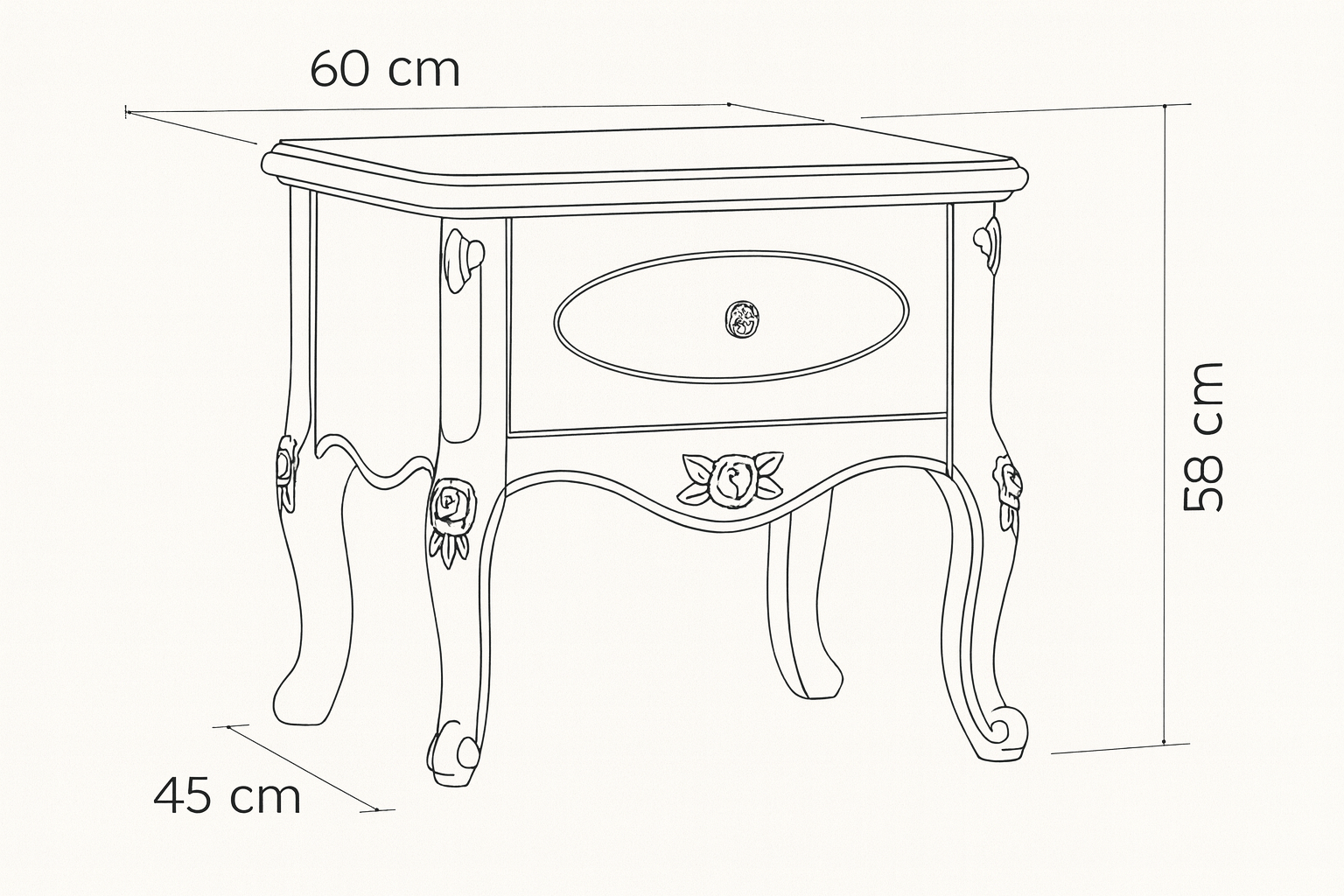 Szafka nocna Elisa to wyrafinowany mebel, który doskonale łączy klasyczne wzornictwo z funkcjonalnością, wnosząc do sypialni nutę francuskiej elegancji. Wykonana z płyty MDF oraz drewna, wyróżnia się solidnością oraz precyzją wykonania. Zaokrąglony blat oraz subtelnie profilowane krawędzie dodają lekkości, a eleganckie, wygięte nogi ozdobione są dekoracyjnymi rzeźbieniami kwiatowymi, które podkreślają romantyczny styl mebla. Dodatkowe detale, takie jak finezyjne motywy na froncie oraz delikatne żłobienia, nawiązują do klasycznych, francuskich wzorów, tworząc harmonijną całość.