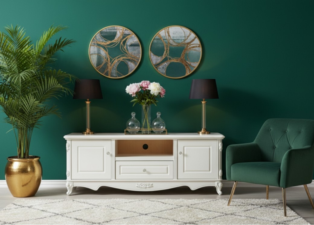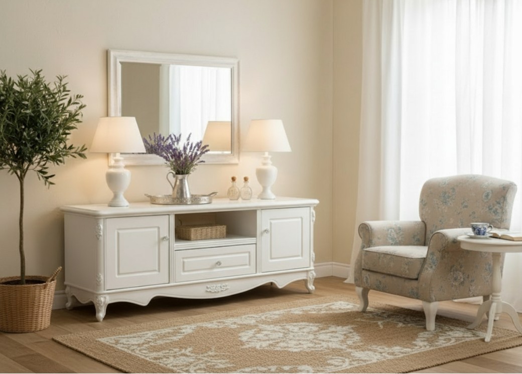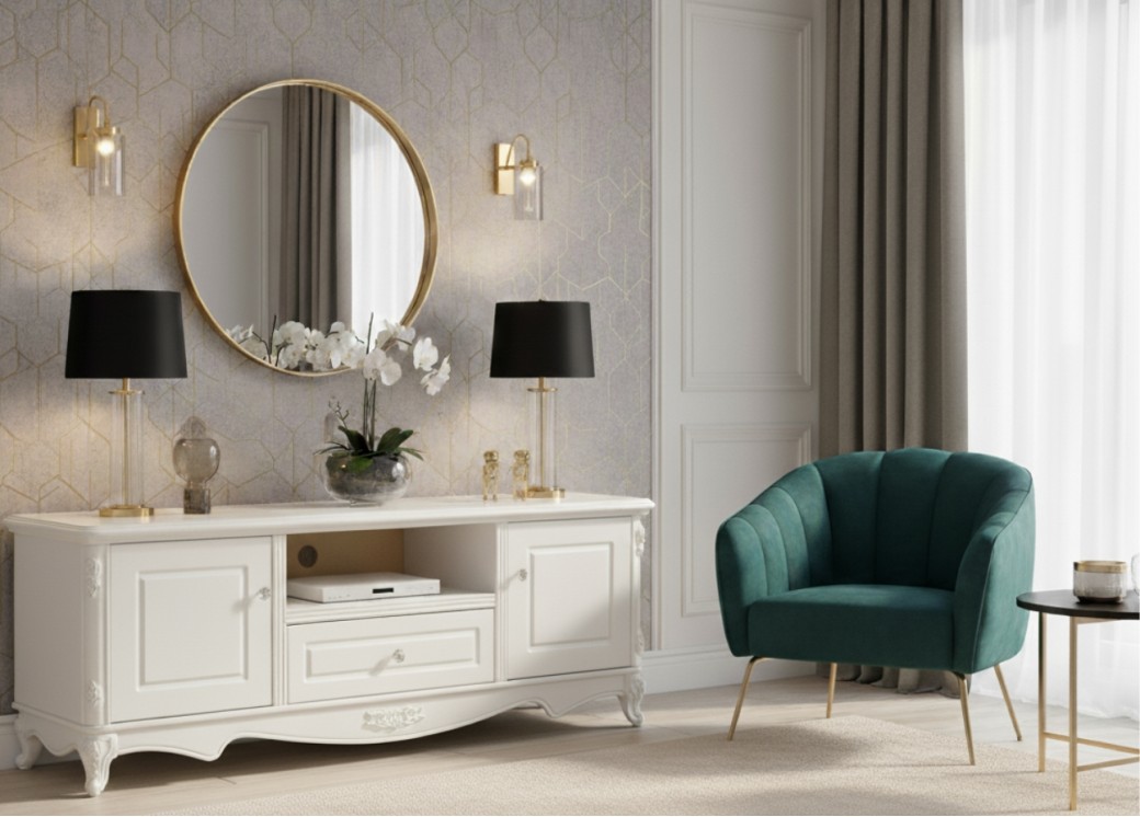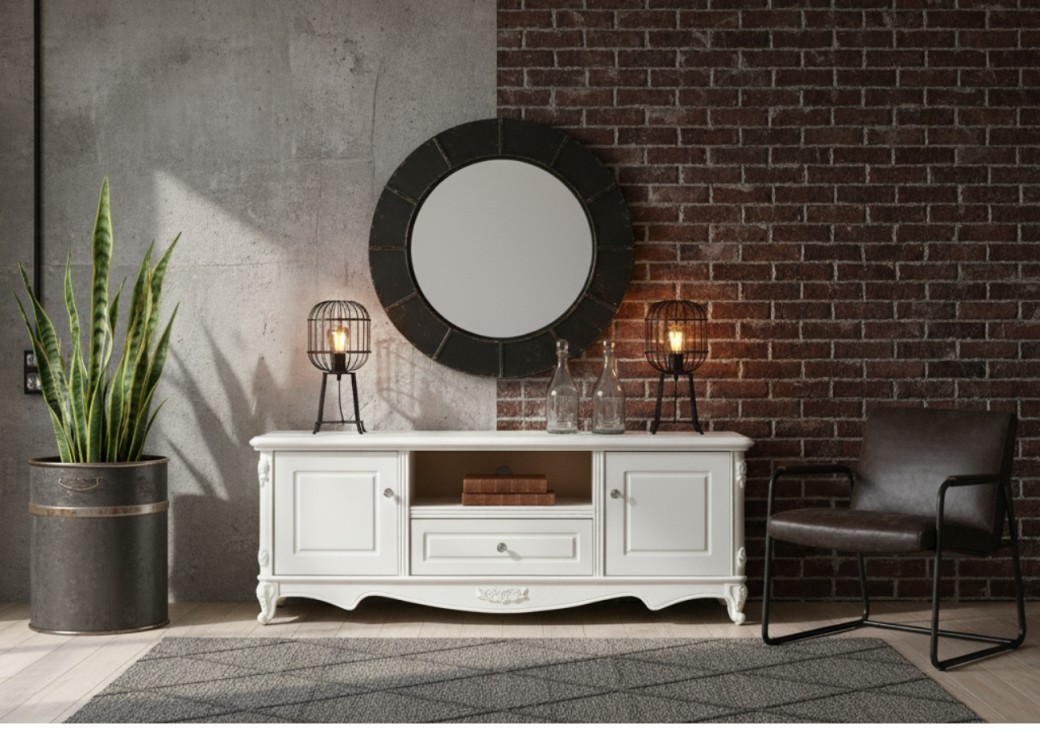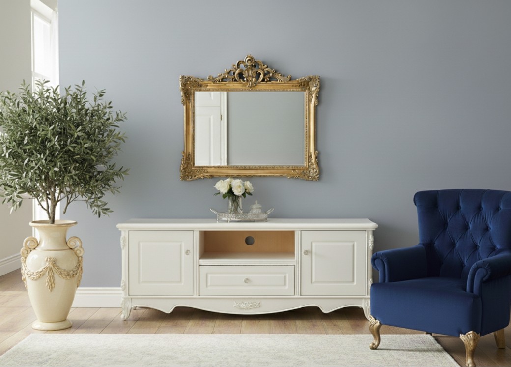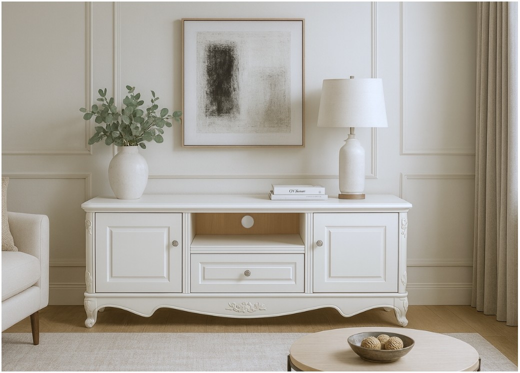 Szafka RTV Anastasia to elegancki mebel, który łączy styl francuski z funkcjonalnością, tworząc idealne rozwiązanie do każdego salonu inspirowanego klasycznym designem. Wykonana z płyty MDF i drewna, wyróżnia się trwałością oraz dbałością o detale, a jej subtelnie zaokrąglone linie dodają lekkości i wyrafinowania. Szafka posiada dwoje drzwi z ozdobnymi frontami, które zapewniają przestrzeń do przechowywania akcesoriów i drobnych sprzętów RTV, dzięki czemu wnętrze pozostaje uporządkowane.