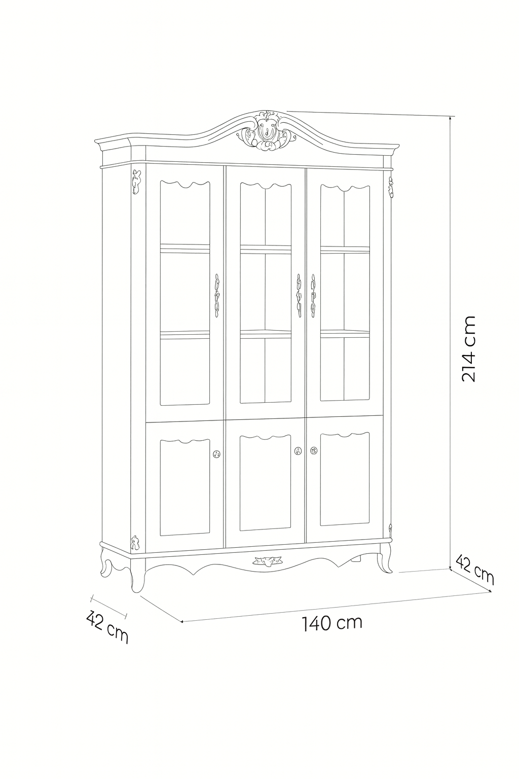 Witryna Alaia to wyjątkowy mebel, który łączy elegancję stylu francuskiego z funkcjonalnością, idealną do salonu, jadalni lub gabinetu. Wykonana z płyty MDF i drewna, zachwyca precyzyjnym wykończeniem oraz delikatnymi rzeźbieniami na froncie, które nadają jej unikalnego charakteru. Gzyms zdobiony finezyjnymi ornamentami i dekoracyjny cokół podkreślają klasyczny styl mebla, wprowadzając do wnętrza subtelną nutę luksusu.